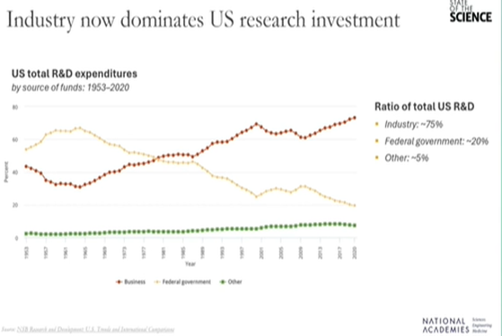 As discussed at both the Symposium and the National Academy of Sciences event, funding for R&D by private U.S. firms has exploded, surpassing that of the federal government in the 1980s and now constituting about 75% of total R&D in the country.